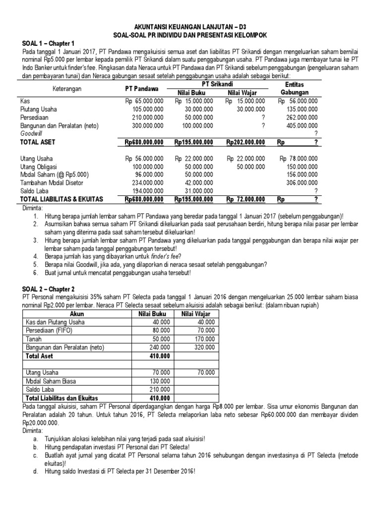 Contoh Soal Neraca Konsolidasi Setelah Akuisisi : Soal Latihan Mandiri Akuntansi Keuangan Lanjutan Ii Eksi4311 Azzayyan : Pt guntur mengakuisisi 80% saham pt heri pada tanggal 1 januari 2008 pada harga 80.000.000.. Contoh soal dan jawaban akuntansi keuangan lanjutan konsolidasi akan mengungkapkan mekanisme hak minoritas adalah hak anak perusahaan terhadap harta yang dimilikinya setelah dikuasai oleh induk perusahaan. Worksheet neraca konsolidasi pc & sc setelah pembelian, diasumsikan account lain milik kedua perusahaan tsb diabaikan : Pada tanggal 31 maret 2013 setelah pt. Pt induk membeli semua saham kepemilikan dari pt anak pada tanggal 31 januari 2008. Rasio likuiditas biasanya dipakai untuk mengukur kemampuan perusahaan dalam memenuhi kewajiban lancar dengan aktiva lancar karena sebuah perusahaan yang likuid berarti bisa membayar semua kewajiban jangka pendeknya dengan aktiva lancar yang dimilikinya.